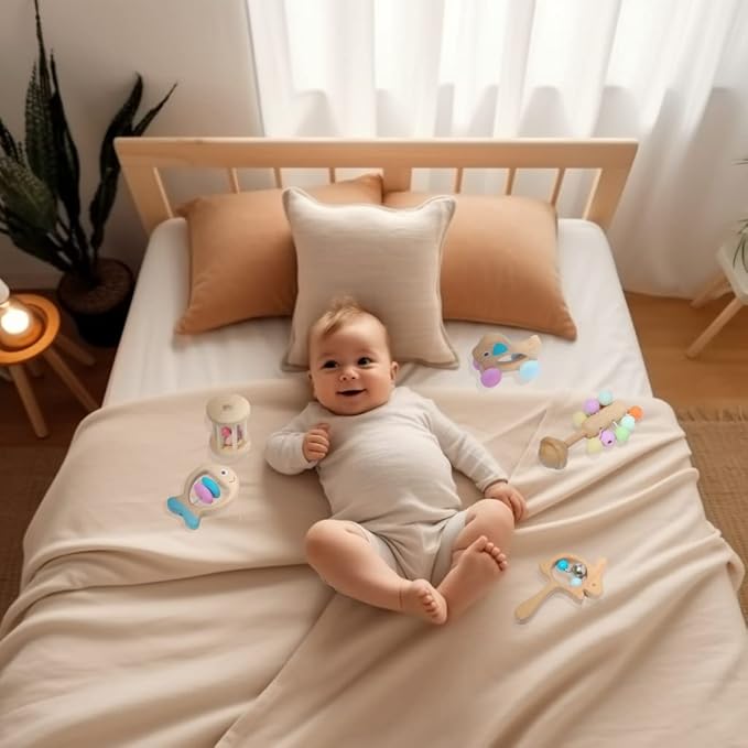 Montessori Mama Wooden Toys for Babies 5-Piece Collection - Multi-Sensory Learning Rattle for Babies - Infant Wooden Toy Set Baby Weights Toys - Teether