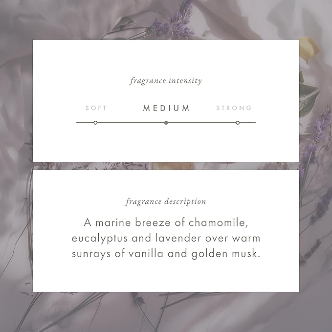 COASTAL LAVENDER: A marine breeze of chamomile, eucalyptus and lavender over warm sunrays of vanilla and golden musk.