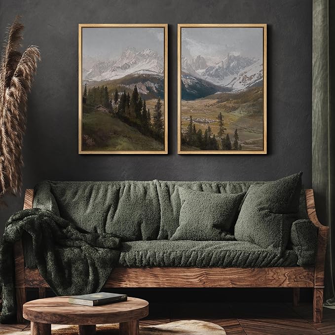 MUDECOR Framed Canvas Print Wall Art Alpine Meadow and Mountain Range Rustic Cabin Nature Nature Wilderness Illustrations Realism Decorative for Living Room, Bedroom, Office - 24"x36"x2 Natural