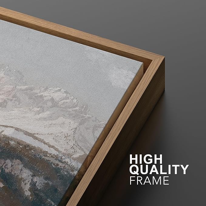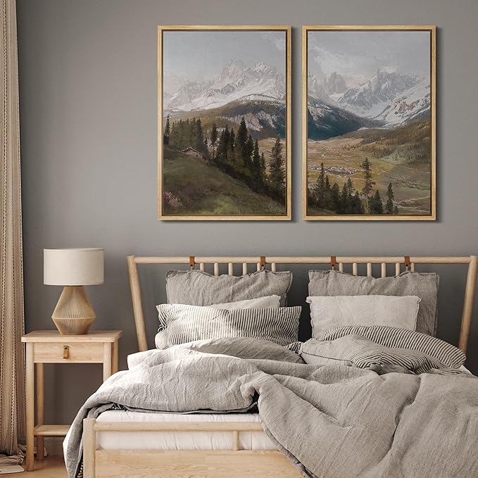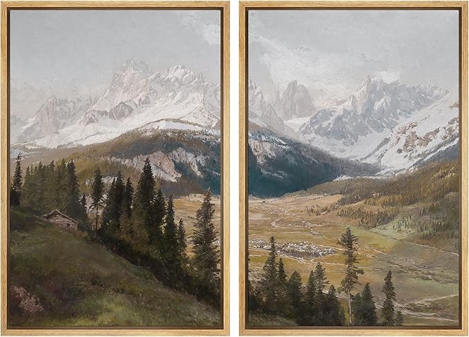 MUDECOR Framed Canvas Print Wall Art Alpine Meadow and Mountain Range Rustic Cabin Nature Nature Wilderness Illustrations Realism Decorative for Living Room, Bedroom, Office - 16"x24"x2 Natural