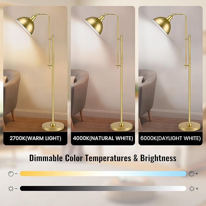 PARTPHONER Industrial Floor Lamp Adjustable, Rustic Farmhouse Reading Lamp in Aged Gold Finish, Modern Standing Lamp with Remote Control Metal Shade for Living Room Bedroom Study Room Office Hotel