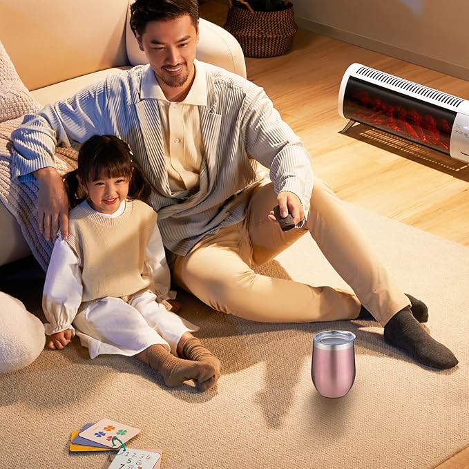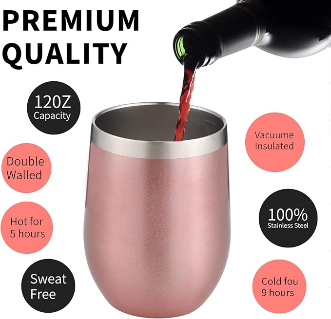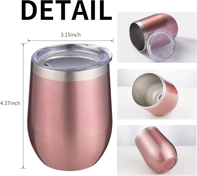 12oz/4 Pack Wine Tumbler Glasses with Lid Stemless Double Wall Vacuum Stainless Steel Travel Tumbler Keeping Cold & Hot for Wine,Coffee,Cocktails,Drinks-Family and Gifts(Rose gold)