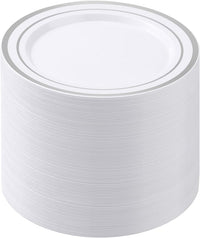 100PCS White Plastic Plates for Party, 7 Inch Heavy Duty Dinner Plates with Silver Rim, Disposable Plates for Wedding and Birthday Sale