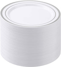 100PCS White Plastic Plates for Party, 10.25 Inch Heavy Duty Dinner Plates with Silver Rim, Disposable Plates for Wedding and Birthday