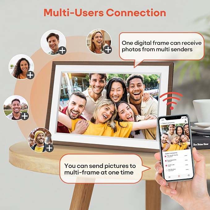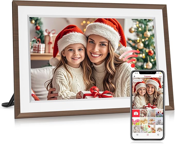 Frameo 10.1" Digital Picture Frame, Smart WiFi Digital Photo Frame with 1280x800 HD IPS Touch Screen 32GB Memory Auto-Rotate Wall Mounted, Share Photos/Videos Remotely(Brown Wood&White)
