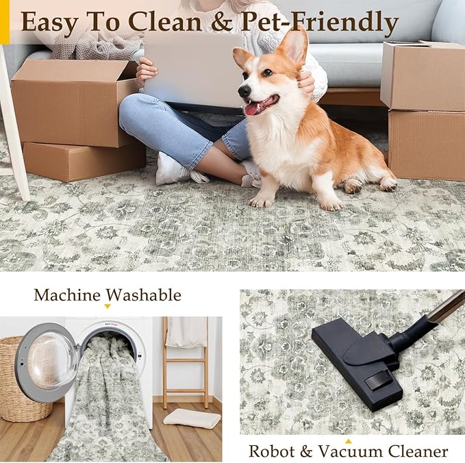 10x12 Neutral Area Rug Green Floral Living Room Bedroom Large Carpet Low Pile Vintage Non-Slip Soft Thin Washable Throw Rug for Dining Room Office Kitchen Indoor Nursery