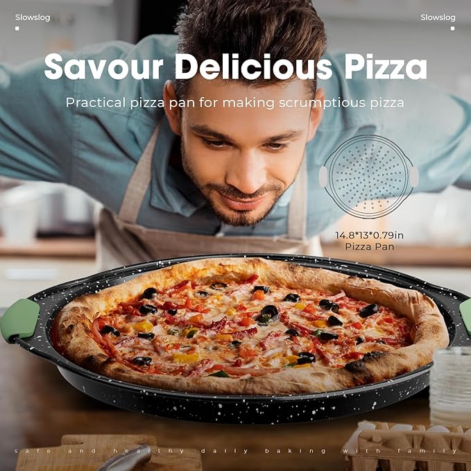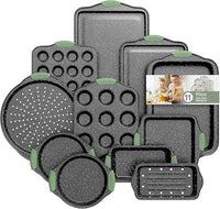 11-Piece Nonstick Bakeware Set, Stackable & Oven-Safe Kitchen Baking Pans with Silicone Handles - Includes Cookie Sheet, Cake Pan, Muffin Tin, Pizza Stone & Bread Loaf Pan, Dark Green&Black