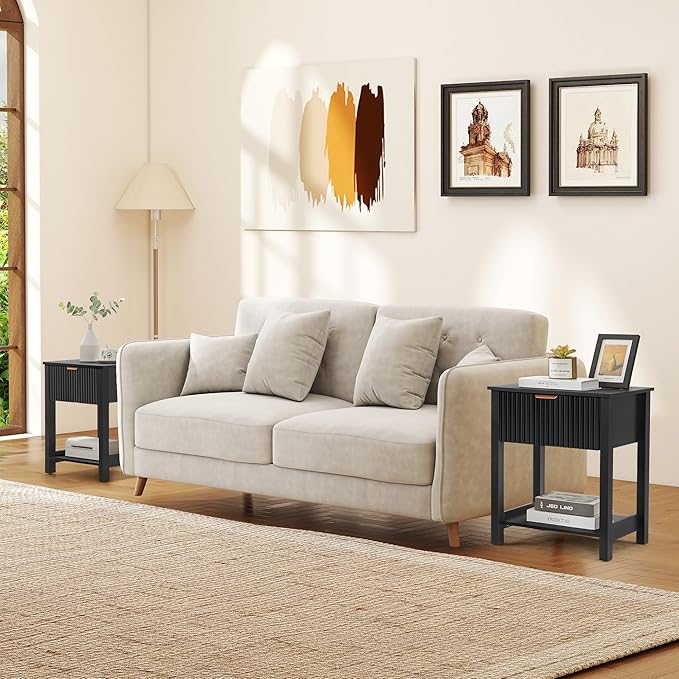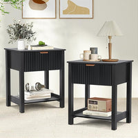Modern Night Stand Set 2 with Drawer, Black Nightstand for Bedroom, Small End Table with Storage, Living Room/Bed Side Table with Drawer for Small Spaces, Fluted Nightstand Set of 2